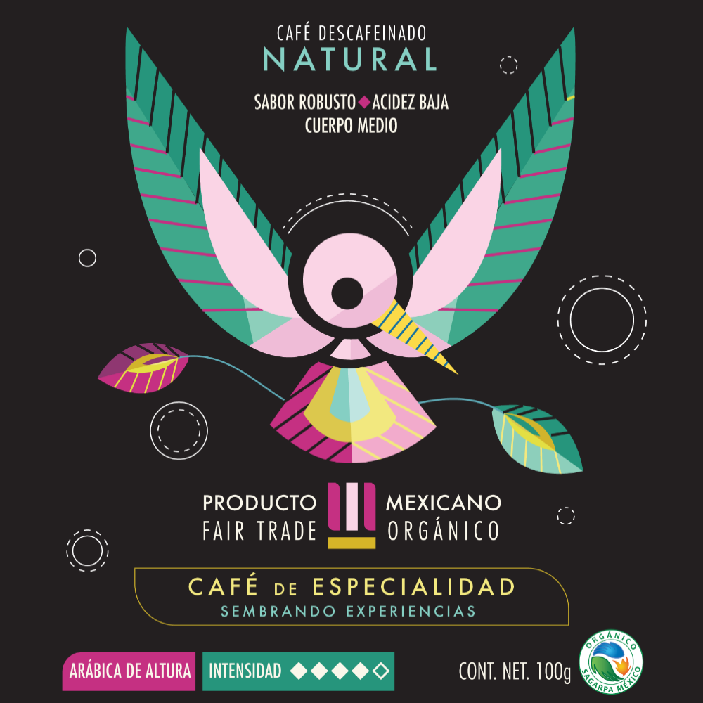 - Nuestro descafeinado natural pasa por un proceso de extracción de la cafeína en el campo con agua natural, esto nos permite conservar su calidad de orgánico. Su presentación es tueste italiano, un excelente café con sabores acentuados, una bebida intensa y dulce a la vez con acidez equilibrada.